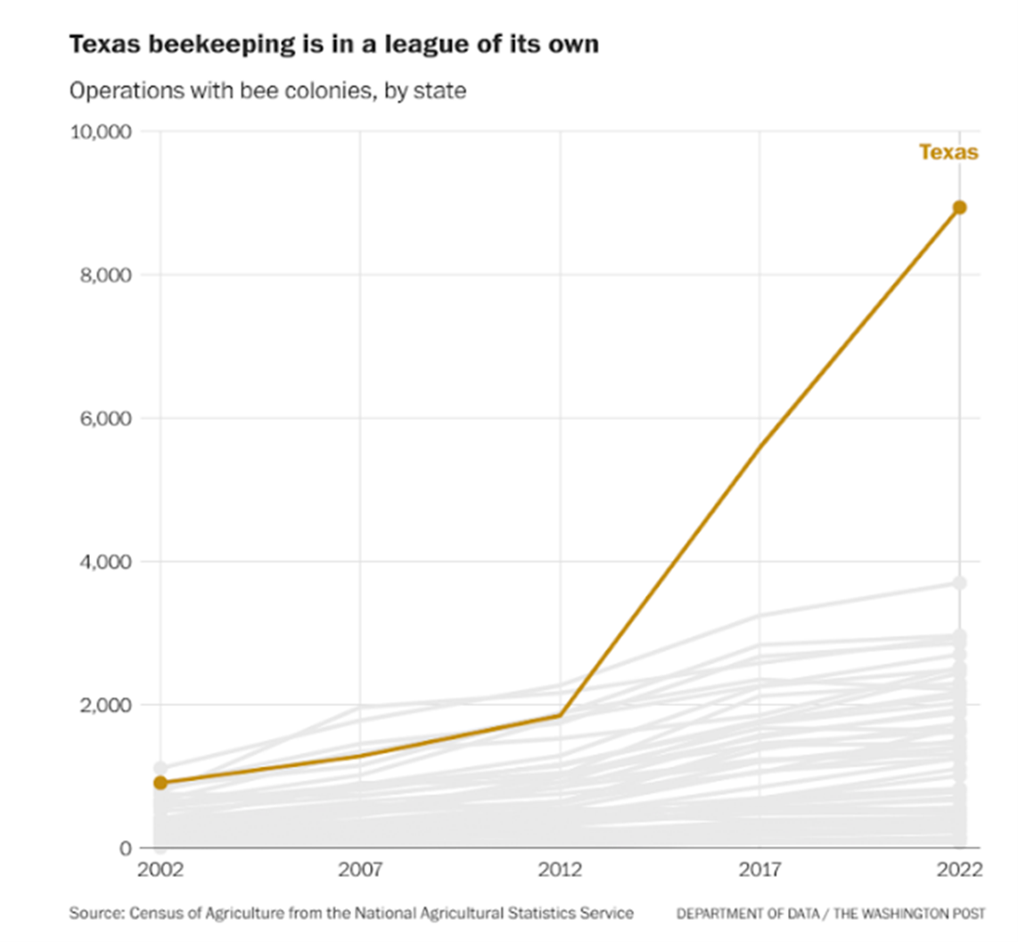Most of America’s new hives can be traced back to Texas, with rapid growth beginning back in 2012, conveniently the year after Texas signed the “bee bill” into law.